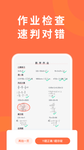 智能检查 智能秒批:只需对准作业轻松一拍,通过AI图像智能识别技术,一秒就能完成批改,并进行针对性的分析讲解,帮助孩子战胜错题