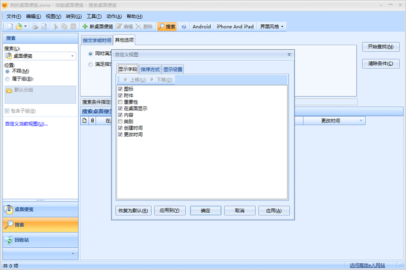 效能桌面便签提供了搜索功能,对于书写便签很多的人来说是非常方便的,搜索的时候可以选择是否根据分组、便签的建立时间、关键字等来进行。