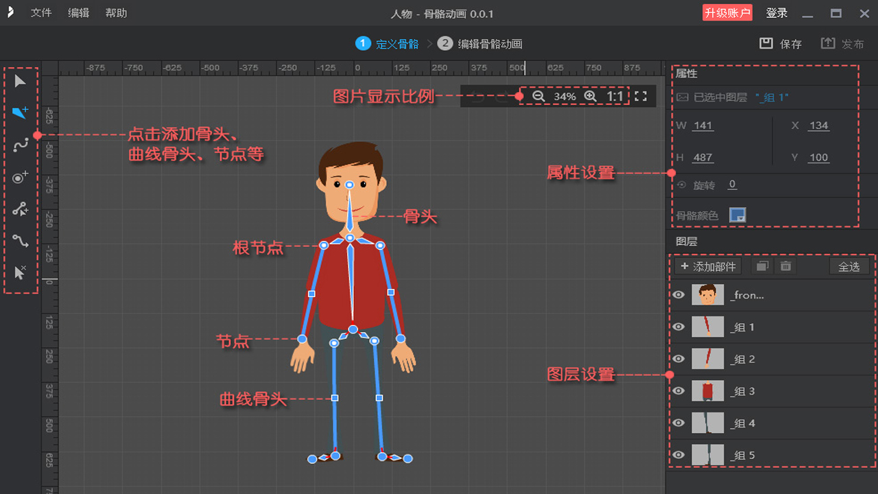 添加骨骼到图片后,可以控制骨骼让角色移动、任意角度旋转。其中曲线骨骼可以让角色的曲线变化更加圆滑流畅,从而让动画角色整体效果达到最佳。
