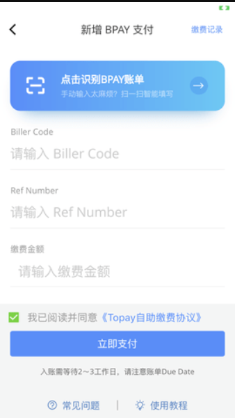 3.在今日支付中输入账单的BPAY Biller Code和Ref Number,并选择支付方式(支付宝、微信支付)继续完成缴费。除了手动输入,今日支付还支持账单图片上传识别。