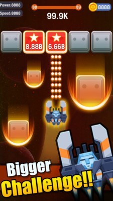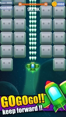 在这个游戏里面,玩家将用自己灵活敏捷的手指驾驶和掌控着飞机,在屏幕上不断的移动,用子弹对准呈现的砖块不停的射击,直到一块一块的消失在眼前,而且还会有往下掉的方块,不仅要消灭还要躲避袭击,要保护好自己的安全才行。