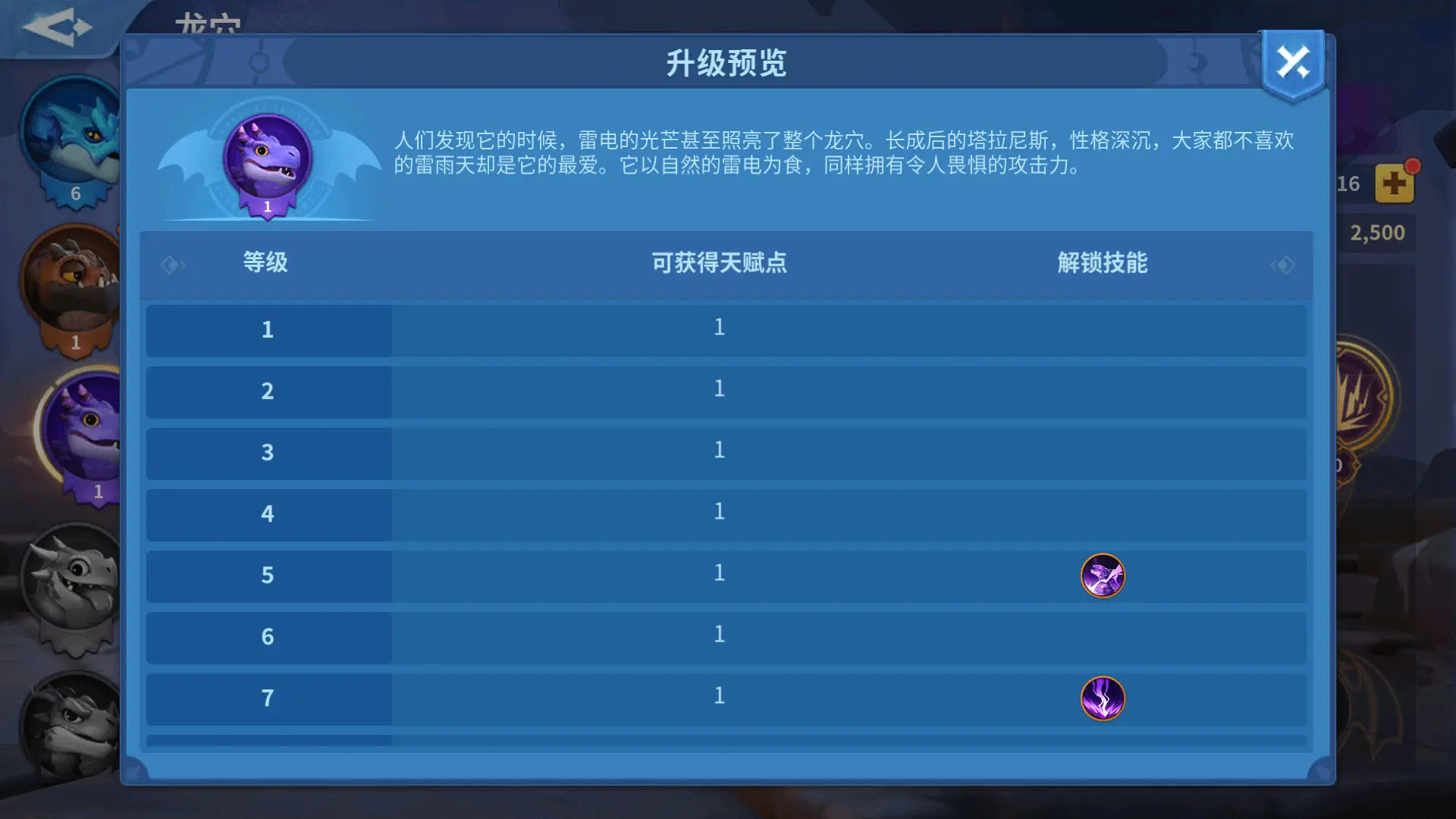 巨龙5级时将解锁主动技能(龙之吐息)槽位,5、7、15、25、35级时分别领悟一个新的主动技能。10级时将解锁被动技能(龙之威慑)槽位,10、12、20、30、40级时分别领悟一个新的被动技能。在龙穴内点击巨龙右上角的书本提示按钮可以查看巨龙的升级效果预览。