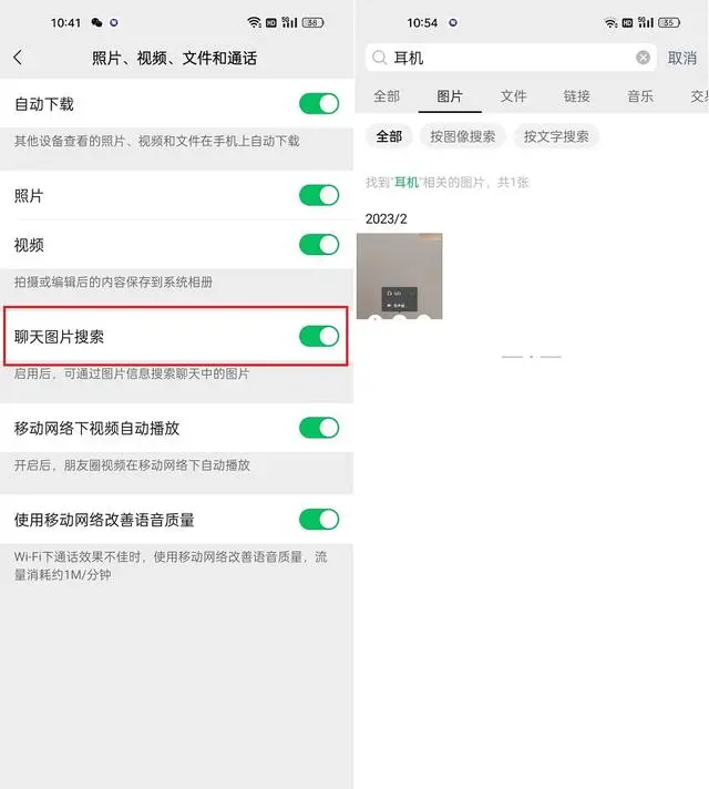 其实这个功能去年就在内测中了,现在终于正式上线了,而且新增了开关可以根据自己需求进行调整。小伙伴们在微信的“我”-“设置”-“通用”-“照片、视频、文件和通话”中就可以看到“聊天图片搜索功能”了,开启之后,可通过图片信息搜索聊天中的图片。