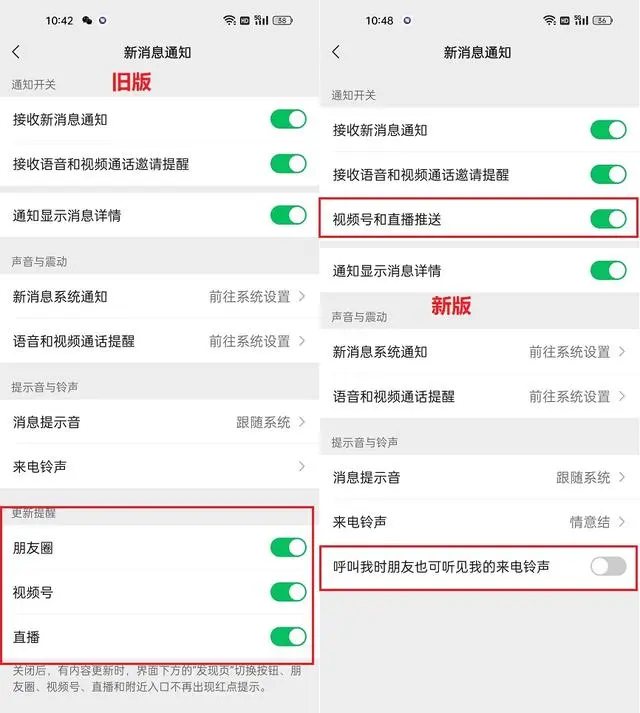 在微信的“我-“设置”-“消息通知”页面,新增了两个功能,分别是“视频号和直播推送”和“呼叫我时朋友也可听见我的来电铃声”功能设置开关。安卓用户也可以对视频和直播进行管理要不要接收推送了。
