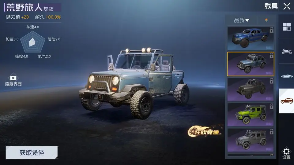 相比其他车型,越野车绝对是众多小伙伴的首选,毕竟在黎明大陆中有着各种复杂地形,而越野车则可以轻易载着我们通过这些地形,丝毫不用担心底盘被卡住。目前游戏中可以制造的越野车名为“荒野旅人”。荒野旅人是一辆敞篷越野车,颜值到位,而且连驾驶员在内可以乘坐四个人。它有两种颜色,分别是金属黑与灰蓝。
