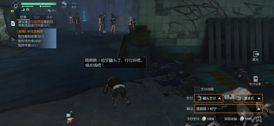 许多玩家路过看到施舍都会猎奇一番,我们只需要大肆乞讨就行,每日有5次感谢对方的机会哦。好好把握,挂机可以但是要保持游戏运行,否则乞讨动作会自动停止。