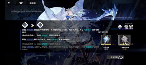 觉醒Lv.1:技能【冰魄剑斩】技能获得吸血效果,若未能成功定身目标,则获得决心,饰品【鬼魅幽兰】觉醒等级提升