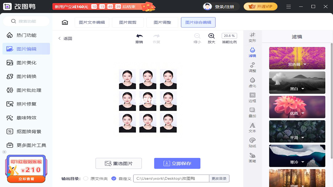 改图鸭是一款免费且易于使用的图片处理软件,可以帮助用户对图片进行简单的编辑和修改。它支持多种常见的图片格式,并提供了多种基本的编辑工具和滤镜效果。用户可以通过简单的操作,对图片进行剪裁和旋转,自定义图片的大小和方向,可以在图片上添加文字和贴纸,增强图片的表现力和趣味性,多种滤镜效果,可以同时对多张图片进行批量处理。