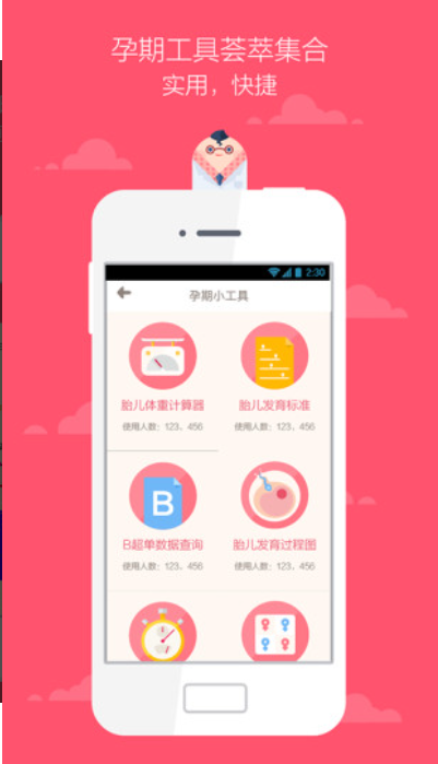 3、 孕期实用工具集合:胎儿体重计算、胎儿发育标准、B超查询、胎儿发育过程图等超多实用工具,让妈妈时刻掌握宝宝健康;
